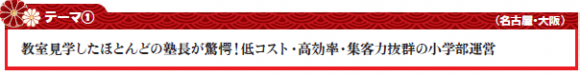 塾のコストは家賃と人件費であるのは釈迦に説法ですが、それを極限まで抑えても集客ができ売上を上げる教室運営を名大SKYでは実践しています。名大SKYの直営校には毎週のように全国各地から教室見学に来られるのですが、ほとんどの塾長先生は「目からウロコでした」といってその運営方法に驚かれています。塾の常識を覆した教室運営は導入いただいた塾様でも実践していただけるシンプルな内容なだけに、成功すること間違い無し!です。